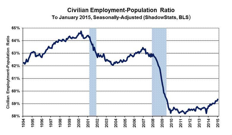 Both the January 2015 headline benchmarked jobs growth of 257,000 and the headline 0.1% increase in the U.3 unemployment rate to 5.7% still remained far removed from common experience and underlying reality. Quality issues continue to reflect extreme seasonal-factor distortions and the general lack of month-to-month data comparability. Discussed frequently in these Commentaries, common experience generally would suggest flat headline monthly payroll employment, plus or minus in January, with a broad unemployment rate—encompassing all short- and long-term discouraged workers—running above 23% (see the ShadowStats-Alternate Unemployment Rate).