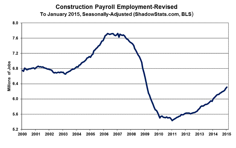 Both the January 2015 headline benchmarked jobs growth of 257,000, and the headline 0.1% increase in the U.3 unemployment rate to 5.7%, remained far removed from common experience and underlying reality. Quality issues continue to reflect extreme seasonal-factor distortions and the general lack of month-to-month data comparability. Discussed frequently, common experience generally would suggest flat headline monthly payroll employment, plus or minus, in January 2015, with a broad unemployment rate—encompassing all short- and long-term discouraged workers—running above 23% (i.e., see the ShadowStats-Alternate Unemployment Measure).