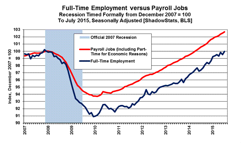 Full-Time Employment versus Part-Time Payroll Jobs. Shown in the accompanying graph, the July 2015 level of full-time employment (Household Survey) still was 0.3-million shy of its precession high, compared to the headline payroll employment level that was 3.7-million above its pre-recession high. Again, the payroll count is of jobs, not people, where much of that payroll "jobs" growth has been in part-time, and in multiple part-time jobs, many taken on for economic reasons, where full-time employment was desired but could not be found, as separately discussed and graphed in the Opening Comments.