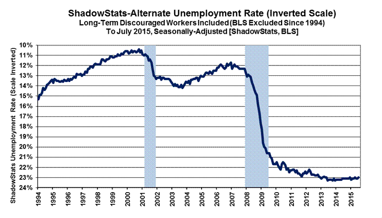 Headline July 2015 Detail. Adding back into the total unemployed and labor force the ShadowStats estimate of the still-growing ranks of excluded, long-term discouraged workers—a broad unemployment measure more in line with common experience—the July 2015 ShadowStats-Alternate Unemployment Estimate, eased to 23.0%, versus 23.1% in June. The July reading was down from the 23.3% series high in 2013 (back to 1994).