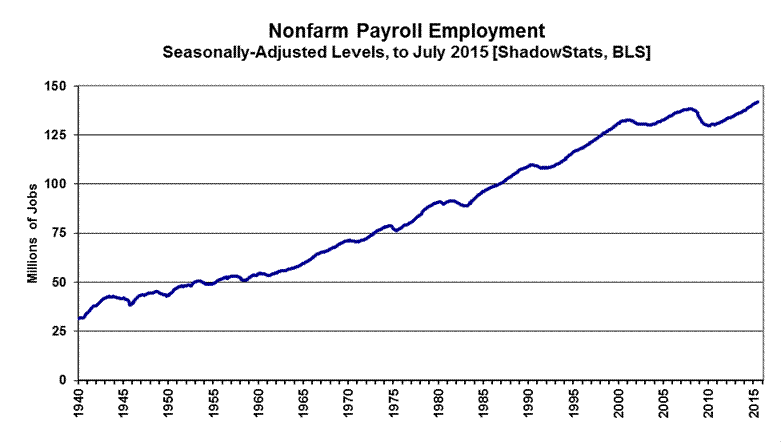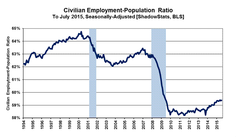 July 2015 Unemployment: 5.3% (U.3), 10.4% (U.6), 23.0% (ShadowStats)