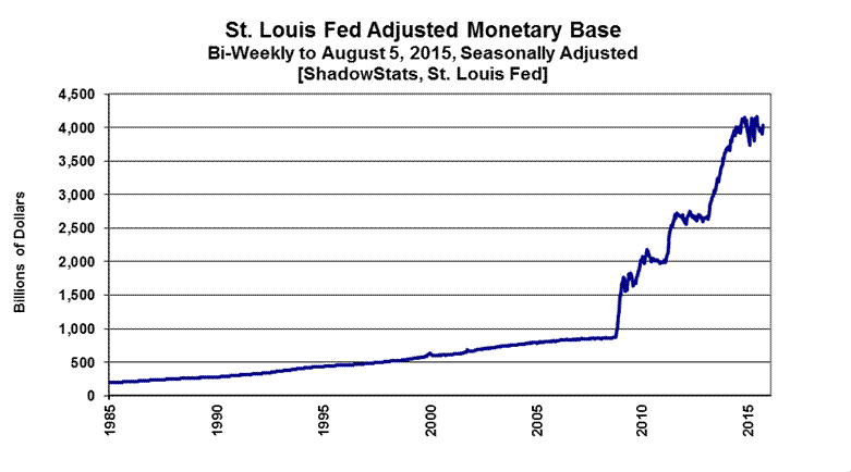The Hyperinflation Watch updates current monetary conditions, along with the initial estimate of the ShadowStats Alternate Measure of M3 Money Supply for July 2015. The revised Hyperinflation Outlook Summary section has expanded and evolved into a Special Commentary, which will be published on Monday (August 10th). Elements of the new report have been discussed piecemeal in recent Opening Comments (see Commentary No. 737, Commentary No. 738 and Commentary No. 739, for example), but the basic outlook and underlying fundamentals have not changed. The most-recent version of the summary outlook remains available in Commentary No. 735.