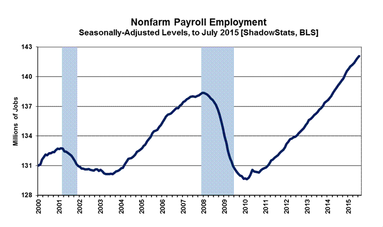 Otherwise, the headline reporting for July 2015 payroll employment and unemployment were in line with market expectations, with minimal revisions to the payroll data. Of course, all of that was in the context of the usual reporting biases and distortions discussed in the opening paragraphs of the Reporting Detail section.