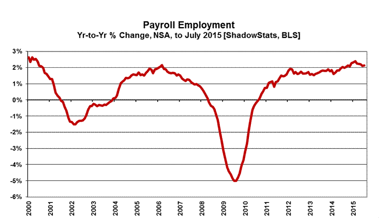 The graph immediately following reflects headline July 2015 U.3 unemployment at 5.26%, versus 5.28% in June; headline July U.6 unemployment at 10.39%, versus 10.52% in June; and the headline July ShadowStats unemployment estimate at 23.0%, versus 23.1% in June. Again, the ShadowStats-Alternate Unemployment series is built upon the BLS reporting of seasonally-adjusted U.3 and U.6 series, and correspondingly, is affected by the reporting and annual seasonal adjustments to those underlying series.