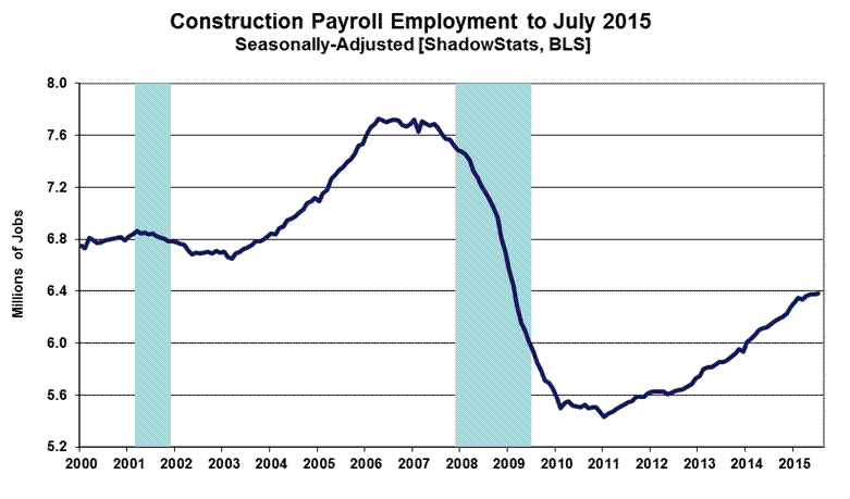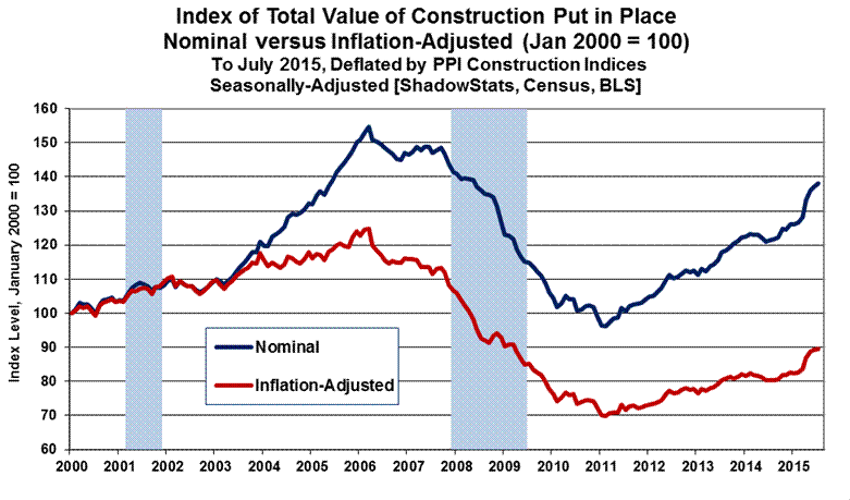Graphs 4 to 7 in the Opening Comments section show comparative nominal and real construction activity for the aggregate series as well as for private residential- and nonresidential-construction and public construction spending. Seen after adjustment for inflation, the aggregate series had remained in low-level stagnation into first-quarter 2015. It spiked in recent months, but slowed in the last two months of reporting, with the real series in July 2015 still holding at 28.3% (-28.3%) below its pre-recession peak of March 2006. The general pattern of real activity remains one of low-level, albeit up-trending stagnation. The aggregate nominal detail is shown here in Graph 14, with the real detail in Graph 15.