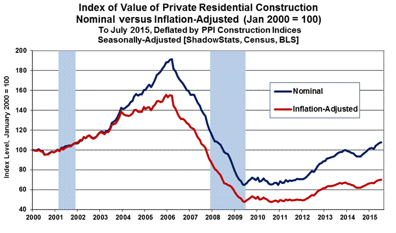 Construction and Related Graphs. The earlier Graphs 14 and 15 reflected total construction spending through July 2015, both in the headline nominal dollar terms, and in real terms, after inflation adjustment. The inflation-adjusted graph is on an index basis, with January 2000 = 100.0. Adjusted for the PPI’s NCI measure through October 2009 and the PPI’s Final Demand Construction Index thereafter, real aggregate construction spending showed the economy slowing in 2006, plunging into 2011, then turning minimally higher in an environment of low-level stagnation, trending lower from late-2013 into mid-2014 and in a low-level uptrend into 2015, with a recent spike that now appears to be topping out.