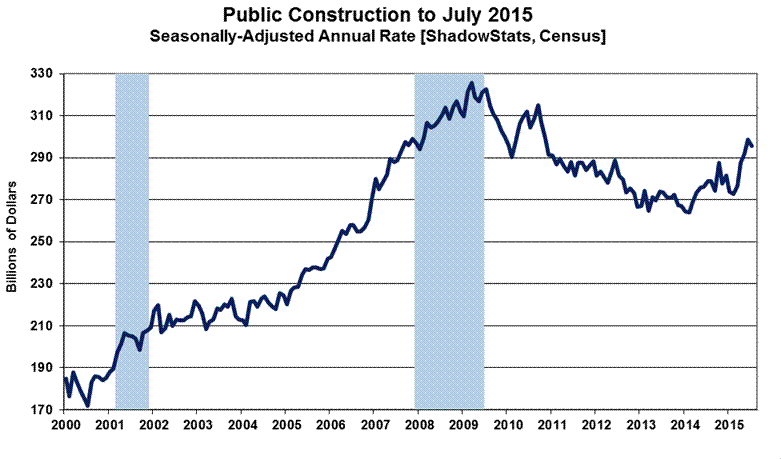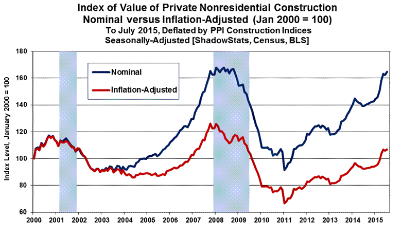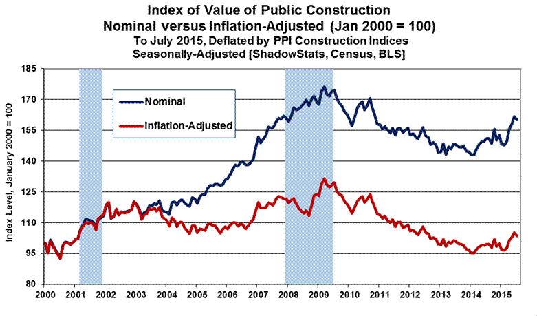 The following Graphs 4 to 7 show comparative nominal and real construction activity for the aggregate series as well as for private residential- and nonresidential-construction and public construction spending. Seen after adjustment for inflation, the aggregate series had remained in low-level stagnation into first-quarter 2015. It spiked in recent months, but slowed in the last two months of reporting, with the real series in July 2015 still holding at 28.3% (-28.3%) below its pre-recession peak of March 2006. The general pattern of real activity remains one of low-level, albeit up-trending stagnation.
