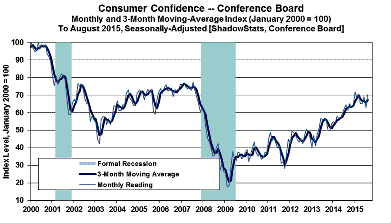 August Payroll Gain Expectations Now Are Above the Implied Monthly Trend. As published previously by ShadowStats-affiliate www.ExpliStats.com, in its analysis of the biases built into the BLS’s concurrent-seasonal-factor modeling of the July 2015 payroll-employment reporting, the built-in-bias trend for August 2015 is for a headline monthly employment gain of 198,000 (see Commentary No. 741). Where consensus forecasts usually settle-in near the trend level, early-consensus expectations had been 3,000 jobs shy of the trend number, but expectations have moved higher by 20,000 jobs or so in the past week.
