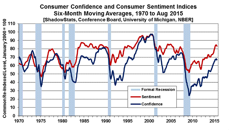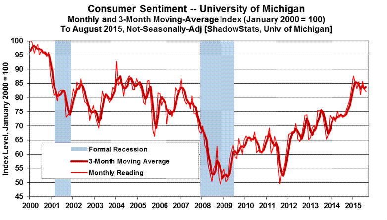 Consumer Confidence and Sentiment. The first three graphs reflect the latest headline activity in consumer confidence and sentiment. The Conference Board’s Consumer-Confidence Index (Graph 5) and the University of Michigan’s Consumer-Sentiment Index (Graph 6) for the full-month of August 2015 moved in opposite directions, with confidence up sharply, as surveyed primarily before recent financial-market turmoil, and with sentiment lower for the month. Both series continued to move lower, though, smoothed for their three-month and six-month moving-average readings. The confidence and sentiment series tend to mimic the tone of headline economic reporting in the press, and often are highly volatile month-to-month, as a result. With increasingly-negative, headline economic reporting ahead, successive negative hits to both the confidence and sentiment readings remain likely in the months ahead.