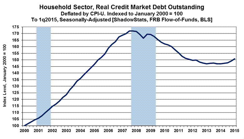Consumer Credit. The next two graphs address consumer borrowing. Debt expansion can help make up for a shortfall in income growth. Shown in Graph 8 of Household Sector, Real Credit Market Debt Outstanding, household debt declined in the period following the Panic of 2008, and it has not recovered. The series includes mortgages, automobile and student loans, credit cards, secured and unsecured loans, etc., all deflated by the headline CPI-U. The level of real debt outstanding has remained stagnant for several years, reflecting, among other issues, lack of normal lending by the banking system into the regular flow of commerce. Updated through first-quarter 2015, the graph reflects the most-recent detail available from the Federal Reserve’s flow-of-funds data.