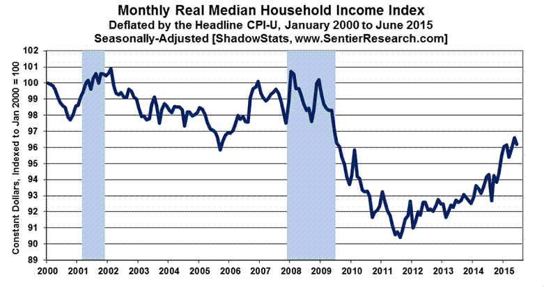 The Graph 10 shows monthly real median household income through June 2015, as reported by www.SentierResearch.com. This measure of real (inflation-adjusted) monthly median household income turned lower in June, reflecting flat, month-to-month nominal median income hit by rising consumer inflation. A similar circumstance generated a headline plunge in second-quarter 2015 real average weekly earnings, discussed in Commentary No. 745. The income series has been in low-level stagnation, with a recent uptrend boosted by dropping gasoline prices. Where negative inflation boosts the level of real growth relative to nominal growth, recent relative "strength" in the series largely reflected temporary, gasoline-price-driven, headline month-to-month contractions in CPI-U reporting, and flat-to-minus annual inflation. That monthly inflation issue reversed in May and June reporting.