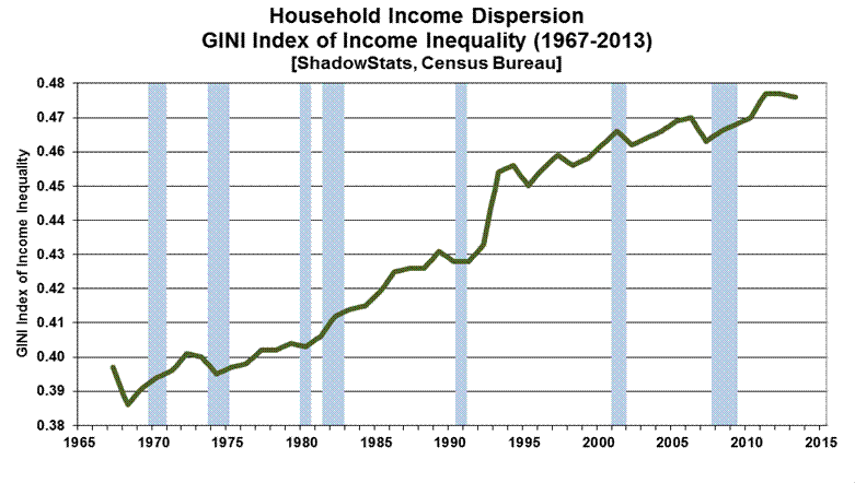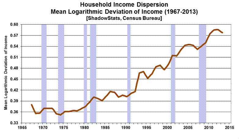 Rising and near-record income dispersion levels usually foreshadow economic and financial-market turmoil. Despite—or perhaps due to—the ongoing nature of the economic and systemic-solvency crises, and the effects of the 2008 financial panic, income dispersion—the movement of income away from the middle towards both high- and low-level extremes—held near record highs in 2013, instead of moderating, as often has been seen otherwise during periods of financial distress.