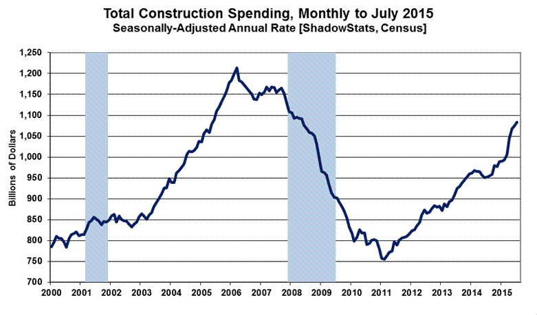 On a year-to-year or annual-growth basis, July 2015 nominal construction spending rose by a statistically-significant 13.7% +/- 2.3%, versus a revised annual gain of 13.2% [previously up by 12.0%] in June 2015.