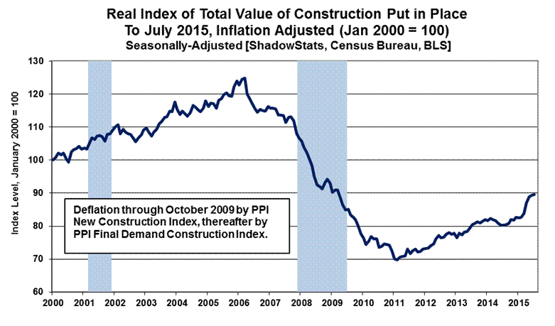 Reflecting all revisions and full quarterly reporting, second-quarter 2015 real construction spending (deflated by PPI construction inflation) showed a revised, annualized 28.3% quarterly gain, versus an unrevised 4.1% annualized gain in first-quarter 2015. Based solely on the initial headline reporting for July 2015, third-quarter annualized growth was on track for an annualized 5.3% gain.