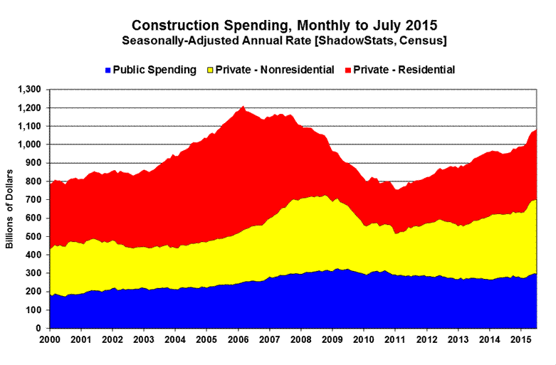 Headline Reporting for July 2015. The Census Bureau reported September 1st the headline, total value of construction put in place in the United States for July 2015 was $1,083.4 billion, on a seasonally-adjusted—but not-inflation-adjusted—annual-rate basis. That estimate was up by a statistically-insignificant 0.7% +/- 1.8% (all confidence intervals are at the 95% level), versus a revised $1,075.9 [previously $1,064.6] billion in June. In turn, June spending also was up by a revised 0.7% [previously up by 0.1%] versus a revised $1,068.4 [previously $1,063.5, initially $1.035.8] billion in May 2015. In turn, May spending was up by 2.3% from an unrevised $1,044.6 billion in April.