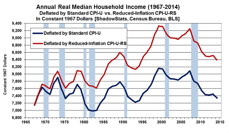 2014 Household Income Measures Signal More Trouble Ahead. These Opening Comments focus on U.S. consumer conditions. First to be covered are the 2014 annual income measures published today (September 16th) by the U.S. Census Bureau (Census) in its 2014 Poverty Report. Second are updated details on the various measures of consumer liquidity and attitudes regularly followed by ShadowStats.