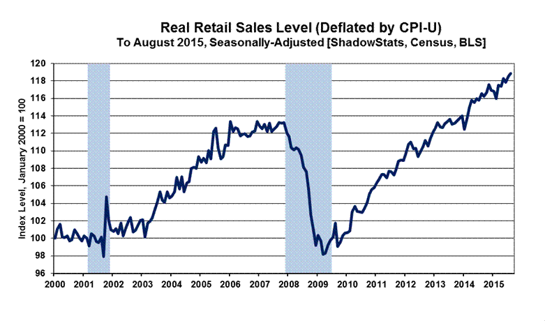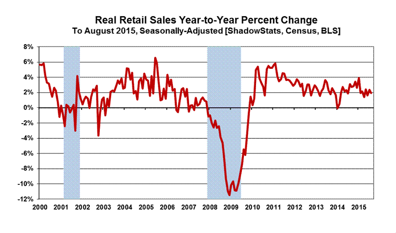 Real Retail Sales—August 2015—Recession Signal Continued. Not adjusted for inflation, headline nominal retail sales rose by 0.19% in August 2015, following an upwardly revised gain of 0.71% in July 2015, as detailed in yesterday’s Commentary No. 751 of September 15th. Year-to-year growth in August 2015 nominal retail sales was 2.16%, versus an upwardly revised 2.59% annual gain in July 2015.