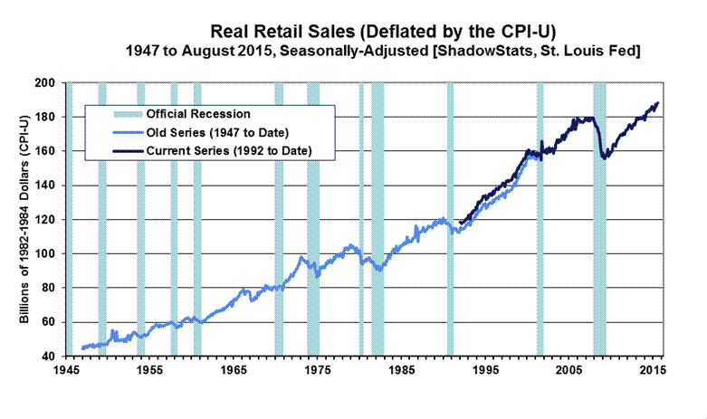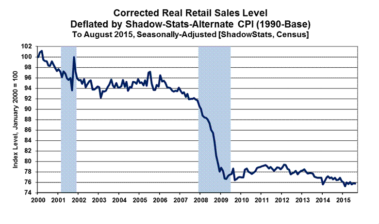Irrespective of first-quarter 2015 reporting weakness, the apparent “recovery” in the real retail sales series (and other series such as industrial production and GDP) up through year-end 2014 was due largely to the understatement of the rate of inflation used in deflating retail sales and other series. As discussed more fully in Chapter 9 of 2014 Hyperinflation Report—Great Economic Tumble – Second Installment, deflation by too-low an inflation number (such as the CPI-U) results in the deflated series overstating inflation-adjusted economic growth.