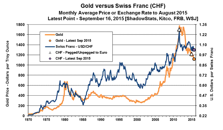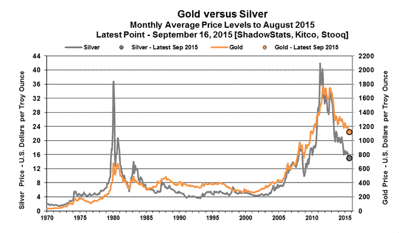 In like manner, the all-time high nominal price for silver in January 1980 of $49.45 per troy ounce (London afternoon fix, per silverinstitute.org)—although approached in 2011—still has not been hit since 1980, including in terms of inflation-adjusted dollars. Based on August 2015 CPI-U inflation, the 1980 silver-price peak would be $151 per troy ounce and would be $708 per troy ounce in terms of August 2015 ShadowStats-Alternate-CPI (1980-Base) adjusted dollars (again, all series not seasonally adjusted).