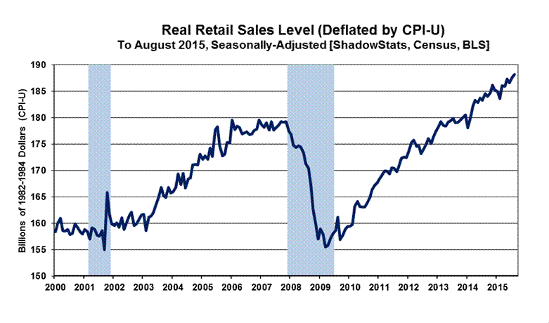 Real Retail Sales Graphs. Graph 19, the first of the four graphs following, shows the level of real retail sales activity (deflated by the CPI-U) since 2000; Graph 20 shows the year-to-year percent change for the same period. The level of headline monthly activity turned lower for the third consecutive month, in February 2015, showing signs of faltering sales. March showed some rebound, but that quarter remained in contraction. April was down, but headline activity bounced back in May, dropped in June and rebounded in July and August.