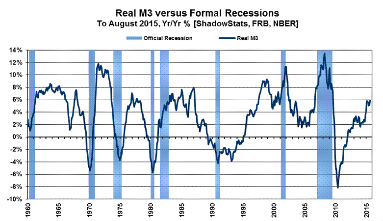 Real (Inflation-Adjusted) Money Supply M3—August 2015. The signal for a double-dip, multiple-dip or simply protracted, ongoing recession, based on annual contraction in the real (inflation-adjusted) broad money supply (M3), remains in place and continues, despite real annual M3 growth having rallied in positive territory for several years. As shown in the accompanying graph—based on August 2015 CPI-U reporting and the latest ShadowStats-Ongoing M3 Estimate—annual inflation-adjusted growth in M3 for August 2015 annual growth rose to 5.9%, versus an unrevised 5.4% in July 2015. Such reflected primarily a continued a sharp jump in the pace of nominal annual headline M3 growth (see Commentary No. 749) versus a minimally-positive swing in the annual inflation rate.