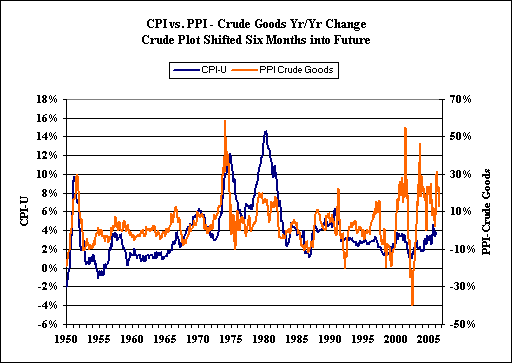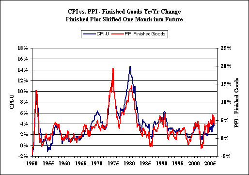 Shown above, finished goods has a 93% correlation, with a one-month lead time, to the CPI; intermediate goods has a 77% correlation with a three-month lead; and crude goods has a 39% correlation with a six-month lead. As can be seen in the relative scales of change for the various PPI measures versus the CPI, the cruder the measure, the more volatile are the monthly year-to-year changes. Also, the cruder the index, the smaller the portion of the CPI it affects, and the more the PPI inflation rate is dampened in the ultimate CPI.