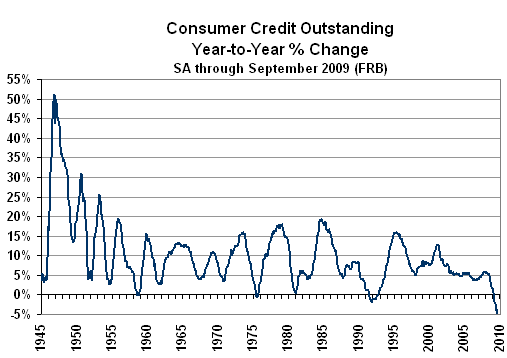 Updated Outlook: Inflation Is on the Rebound. Formal CPI-U deflation, defined as negative year-to-year change in consumer prices of goods and services, and as reported for the last seven months, has about run its course. The deflation numbers were driven by a collapse in oil and related energy prices in the latter part of 2008. Annual inflation has been ticking higher (less negative) since July, as oil prices bottomed and then began to rise anew in response to Mr. Bernanke’s efforts to debase the U.S. dollar and to impair the dollar’s foreign exchange rate. Positive annual inflation will be in place by next month’s reporting of the November CPI. Inflation induced by a weakening dollar tends to reflect higher import and commodity prices that are not driven by a pick-up in U.S. economic demand. Recent reporting indicates continuing credit contraction and a widening trade deficit. Both factors have negative implications for broad economic activity, as discussed below. The economy remains in its most severe economic downturn since the onset of the Great Depression, and the systemic liquidity crisis is ongoing. As mentioned in the prior Commentary, the general outlook is unchanged. Equity markets remain highly vulnerable to minor shocks, potentially with extreme instability. Such is due partially to market expectations being removed so severely from underlying economic and financial-system reality. Irrespective of near-term market gyrations, the long-term outlook remains extremely bearish for U.S. equities and the U.S. dollar, and extremely bullish for gold and silver. The economy still faces an eventual hyperinflationary great depression, with high risk of that circumstance beginning to unfold in the year ahead. Trade Deficit Offers Downside Pressure on Pending 3rd-Quarter GDP Revision. This morning (November 13th) the Census Bureau and Bureau of Economic Analysis reported that the seasonally-adjusted September trade deficit widened to $36.5 billion, from a negatively revised $30.8 billion (was $30.7 billion) in August. Where the nominal September deficit was 18.5% wider than the August shortfall, the net deterioration adjusted for inflation (part of the differential was in higher prices of imported oil) still was 10.2%. Where the "advance" estimate of third-quarter GDP was based on just July and August trade reporting, the reported September deficit deterioration, net of inflation, was enough to offer some downside revision pressure to the upcoming "second estimate" (first revision) of third-quarter GDP growth, which is due for release on November 24th. In nominal terms (not adjusted for inflation) September exports rose by less than imports did. Oil imports increased, based on higher oil prices ($68.17 average per barrel in September versus $64.75 in August) as well as on some catch-up reporting of higher physical import volume (9.5 million barrels per day in September versus 8.7 million in August). It still appears as though irregular paperwork flows through Customs are impairing the reporting accuracy of imports Credit Contraction Pulverizes Recovery Hopes. The latest numbers on consumer and business borrowing all are declining month-to-month and year-to-year and are getting worse, offering no immediate prospects of an economic recovery. Income growth generally is not keeping up with inflation, and without more-than-offsetting debt expansion, the chances of near-term real growth with any short-term sustainability are nil. As shown in the following graph, year-to-year change in consumer credit outstanding fell at a 4.8% annual pace, the deepest annual decline of the post-World War II era. Such followed annual declines of 4.1% in August and 3.9% in July. The year-to-year contraction in September commercial and industrial (C&I) loans also set a post-World War II record decline, and October’s drop will be even worse. Based on 28 days of reporting, October C&I loans fell by about 16.2% year-to-year, following annual contractions of 10.6% in September and 7.1% in August. Commercial paper outstanding, which has been in the throes of negative volatility for more than a year, with some resulting year-ago annual distortions, fell 24.8% year-to-year in October, against a 21.2% annual contraction in September, a 34.8% contraction in August, and a peak annual decline of 37.9% in July. Week Ahead. Given the underlying reality of a weaker economy and a more serious inflation problem than generally is expected by the financial markets, risks to reporting will favor higher-than-expected inflation and weaker-than expected economic reporting in the month ahead. Such is true especially for economic reporting net of prior-period revisions. Retail Sales (October 2009). Due for release on Monday, November 16th, October retail sales are expected to jump month-to-month by 0.9% (Briefing.com), following September’s 1.5% monthly decline. Monthly growth likely will not exceed the pace of inflation, so the headline number is of some risk of a downside reporting surprise. Index of Industrial Production (October 2009). Due for release on Tuesday, November 17th, October industrial production is expected to rise by 0.3% for the month (Briefing.com), versus a 0.7% gain reported in September. Risk is fairly high of a downside surprise here, too, including a possible downward revision to the September estimate. Producer Price Index (PPI) (October 2009). Due for release on Tuesday, November 17th, the monthly PPI change is irregularly volatile. Expectations appear to be on the negative side of flat for the month-to-month number, but annual inflation should see some pick-up (less negative) in October, turning positive in November or December reporting. Consumer Price Index (CPI) (October 2009). Due for release on Wednesday, November 18th, the month-to-month CPI-U is expected to show a 0.2% increase, per Briefing.com. Due to the sharp reversal of oil and gasoline price trends — in collapse one year ago — annual C