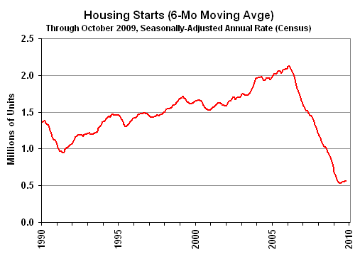 The "recovery" in housing is shown in the above graph. The data are smoothed using a six-month moving average to remove the extreme month-to-month volatility seen in this series. Regardless of any level of smoothing, though, housing starts remain well below any levels seen since the end of World War II.