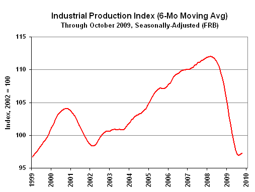 The Federal Reserve reported that seasonally-adjusted October industrial production rose by 0.05% for the month to a level of 98.63, following a revised 0.64% (previously 0.7%) gain in September. Year-to-year contraction in October widened to 7.10% from a revised 6.0% (previously 6.1%) contraction in September. The June 2009 reading of 95.78 had set a record low for annual production growth since the shutdown of war-time production that followed World War II. For the last nine months, the production index has averaged 97.6, around which the series has been fluctuating.