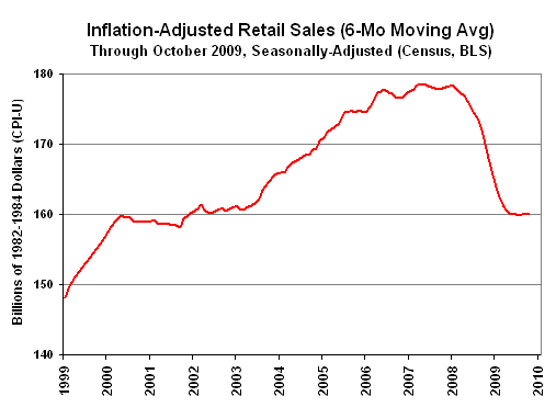 For the last 11 months, monthly real retail sales (CPI-U deflated) have been fluctuating around an average of $160.1 billion. Real sales levels ($ billions) for the past six months were: October 160.6, September 158.9, August (clunkers) 162.4, July 159.7, June 159.9, May 159.7. Smoothed for monthly volatility on a six-month moving-average basis, as shown in the accompanying graph, the pattern of activity here has shifted to bottom bouncing in terms of the level of inflation-adjusted sales. Again, there is no turnaround in economic activity — no recovery — evident here, just bottom-bouncing.