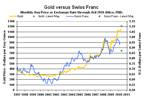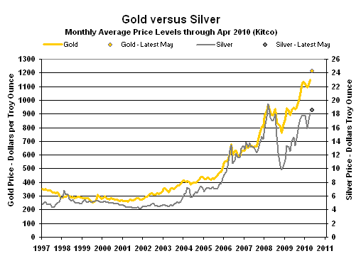 Gold and Silver Highs Adjusted for CPI-U/SGS Inflation. Despite recent all-time highs in the price of gold, in the current cycle, gold and silver prices have yet to approach their historic high prices, adjusted for inflation. Even with the week-ago (May 12th) historic high gold price of $1,237.50 per troy ounce, the prior all-time high of $850.00 (London afternoon fix, per Kitco.com) of January 21, 1980 was not breached in terms of inflation-adjusted dollars. Based on inflation through April 2010, the 1980 gold price peak would be $2,382 per troy ounce, based on not-seasonally-adjusted-CPI-U-adjusted dollars, and would be $7,576 per troy ounce in terms of SGS-Alternate-CPI-adjusted dollars.