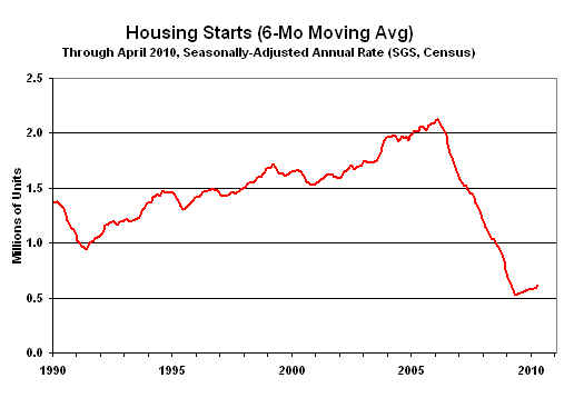 Since December 2008, housing starts have been bottom-bouncing at an historically low level, averaging a seasonally-adjusted annual rate of 572,650. In the past 17 months, all monthly readings have been within the normal range of monthly volatility for the series around that average, including April 2010’s reading of 672,000.