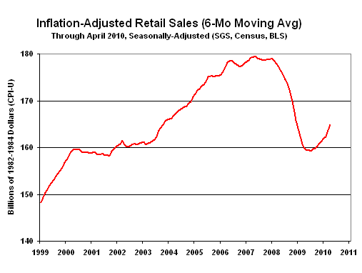 Real Retail Sales. Based on April 2010 CPI-U reporting, inflation- and seasonally-adjusted monthly April retail sales rose by 0.5%, where before inflation adjustment the current number was up by 0.4%, versus a 2.1% monthly real retail sales gain in March, the same as before inflation adjustment. April real retail sales rose by 6.41% year-to-year, versus an 8.8% gain before inflation adjustment. Real March sales were up 6.0% year-to-year, versus an 8.5% gain before inflation adjustment.