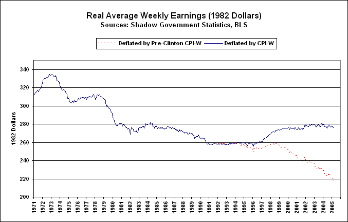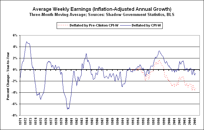 Average weekly earnings in this series are deflated by the CPI-W (for urban wage earners and clerical workers) as opposed to the CPI-U (for all urban consumers), but the CPI-U and CPI-W track each other very closely and are subject to the same reporting biases. The dotted line in the first graph shows the level of real earnings deflated in a manner consistent with the Pre-Clinton Era inflation methodology. Both lines show the seasonally-adjusted monthly earnings level.