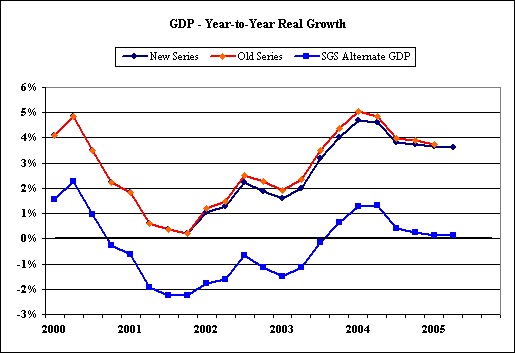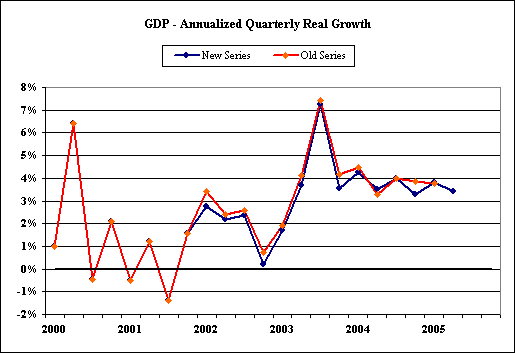 The "advance" estimate of second-quarter 2005 annualized real GDP growth was reported at 3.41% +/- 3.1%, down from the 3.80% growth in the first quarter. The reported growth still is hardly statistically distinguishable from zero growth. Year-to-year real growth in the second quarter held at 3.62% versus 3.64% in the first quarter.