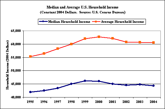 Also reported by the Census Bureau last week were estimates of inflation-adjusted median (meaning the middle measure) and average household income levels for 2004. Of some note, as shown in the second graph, both median and average household income, adjusted for inflation, have been shrinking since 1999/2000.
