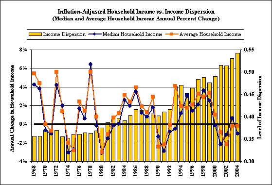 Triggering Greenspan's concern at the time was that variance in U.S. household income had retaken its pre-1987 stock crash high, a level not previously seen, except perhaps before the 1929 stock crash and the ensuing Great Depression. Last week, the Census Bureau released estimates of income dispersion for 2004 that were 30% higher than when the Fed Chairman's knees were knocking. Is this cause for concern? Absolutely! Does Mr. Greenspan have any idea of what really is happening to the economy and the underlying financial system? He does, although he rarely admits or indicates same.