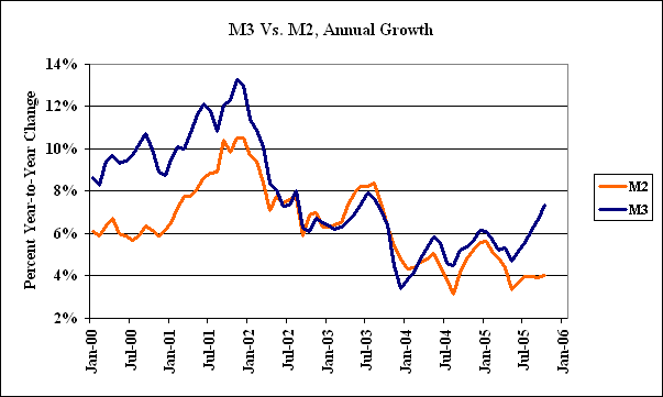On Thursday afternoon, November 10th, after the credit markets had closed for the long Veteran's Day weekend, the Board of Governors of the Federal Reserve System announced it would "cease publication of the M3 monetary aggregate," effective March 23, 2006. As the broadest measure of domestic liquidity, M3 is a key leading indicator and driving factor of both economic activity and inflation (see the May and June 2005 SGS "Reporting Foci" on the money supply).
