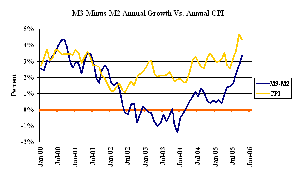 The senselessness of the Fed's statement can be demonstrated by a quick glance at the following two graphs. The first graph shows year-to-year change in both the M3 and M2 measures, the second graph shows the difference of M3 growth less M2 growth, against annual change in CPI-U inflation.