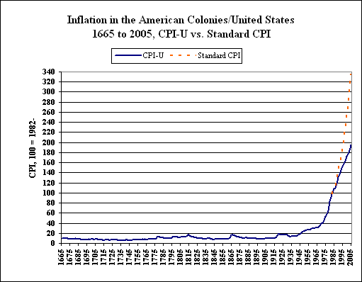 The above graph plots the level of consumer prices during the last 340 years, where Robert Sahr of Oregon State University, using the research of John J. McCusker of Trinity University, San Antonio, Texas, estimated the data for the period 1665 to 1913. The continuing solid line from 1913 to 2005 is the official reporting of CPI-U by the Bureau of Labor Statistics. The dotted line from 1982 to date represents official CPI-U reporting net of methodological changes used during the last two decades to suppress inflation reporting. This "Standard CPI" is as estimated by the BLS in its Consumer Price Index Research Series Using Current Methods (CPI-U-RS) and as applied to the official CPI reporting by Shadow Government Statistics (see the discussion in October 2005 SGS).