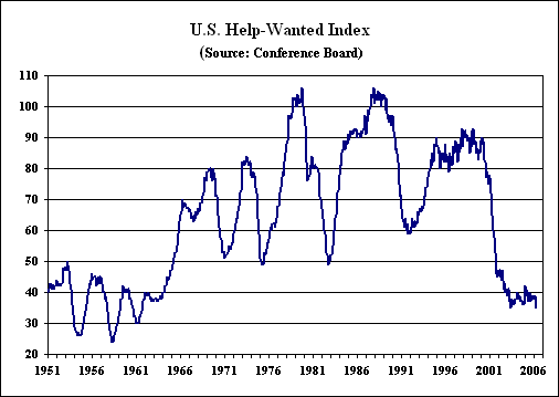 Help Wanted Advertising Index (HWA) -- The April help-wanted advertising index plunged 5.4% (7.9% net of revisions) to 35, the lowest reading since May 2003 and a level previously last equaled in September 1961 (see graph in the opening comments). Annual contraction, on a three-month moving-average basis was 6.7% in April versus 6.6% (previously 5.7%) in March. Annual growth has shown sharp deterioration as the index bottom rolls at the worst level seen since the last recession, and before that in the first year of Kennedy's administration.