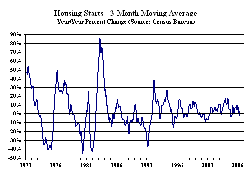Actual home sales, however, seem to be leading housing starts this time around, as developers respond to slowing demand. Existing home sales, which outnumber new homes sales by roughly 6.8 million to 1.2 million per year, began slowing in January 2005. New home sales growth began turning down in August 2005, and housing starts began slowing in November 2005. All three series now are down year-to-year, and the annual contraction in housing starts, on a three-month moving average basis, should exceed 10% by June, signaling a recession.