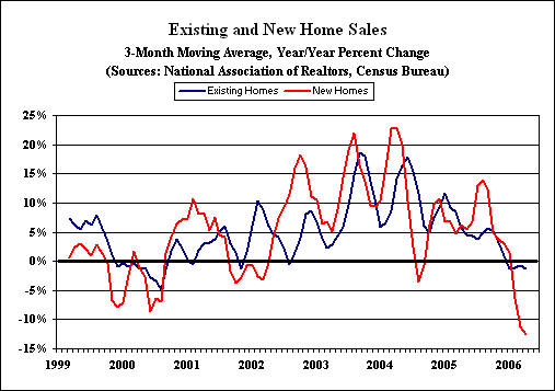 The housing market has been slowing since late 2005, although such is not obvious in all reporting. The housing starts series appears to be near generating a recession signal. While the residential investment component of the GDP shows ongoing solid growth as of first-quarter 2006, home sales data show the downturn already is underway.