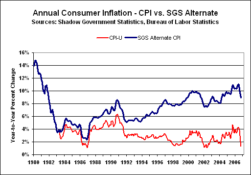 Alternate Realities. In general, if a government economic measure does match common public experience, it has little use outside of academia or the spin-doctoring rooms of the Fed and Wall Street. This section regularly covers the Shadow Government Statistics (SGS) alternate measures of official CPI and GDP reporting. The methodologies for the series are discussed in the August 2006 SGS. Effects of gimmicked methodological changes have been removed from the official series so as to reflect more accurately the common public experience, as embodied by the post-World War II CPI and the pre-Reagan-Era GDP.