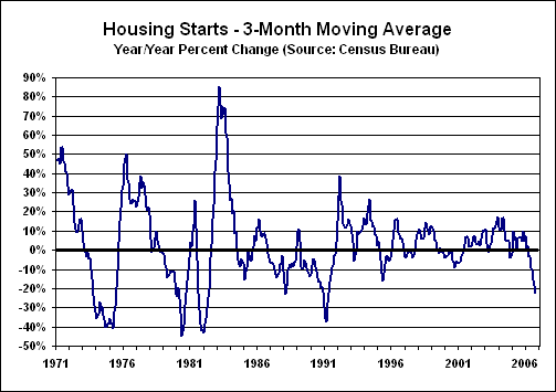 Housing Starts -- Annual change continues to deteriorate. Seasonally-adjusted October housing starts fell by 14.6% +/- 7.6% for the month, following a revised 4.9% (was 5.9%) gain in September. With October's year-to-year change down by 27.4%, following September's 19.4% contraction, the annual change on a three-month moving-average basis now stands at a year-to-year drop of 22.2%, the worst reading since the depths of the 1990/1991 recession. Such is generating an intensifying recession signal.