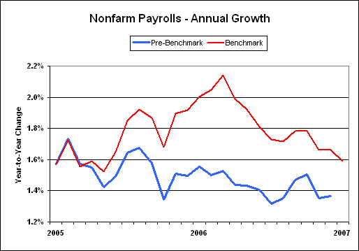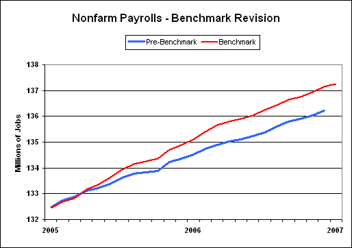 The release of the January 2007 payroll survey included the annual benchmark revision, which added 754,000 jobs to the seasonally-adjusted March 2006 employment level. With the BLS's revision methodology, such translated into an upward revision of 933,000 to the previously reported December 2006 payrolls.