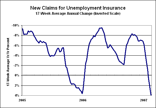 New claims for unemployment insurance, on a 17-week moving average, are surging, which is an economic negative (please note the scale of annual growth is inverted in the graph). The prior surge was tied to the effects of Katrina and the other severe hurricanes of 2005. Somehow, the hurricane effects largely were missed and then further tempered in the benchmark revisions to the payroll data.