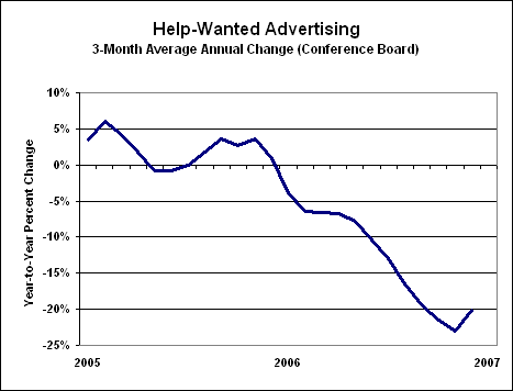 Although help-wanted advertising never recovered from the 2000 recession, annual growth -- based on a three-month moving average -- has fallen deep into new recession territory during the last year.