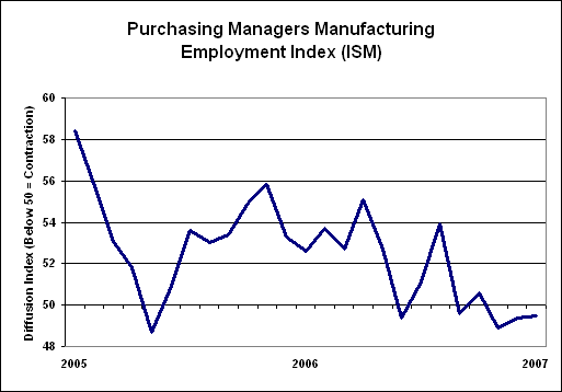 In the last several months, the employment component of the manufacturing purchasing managers survey has had a reading below 50.0, indicating contracting employment. Such is consistent with recession.