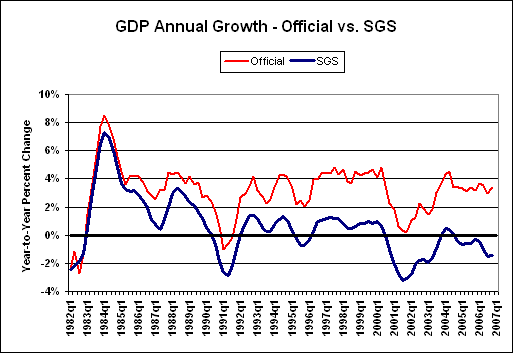 Adjusting for methodological distortions built into GDP reporting over time, the SGS Alternate GDP measure suggests economic reality is much weaker than officially reported, with a year-to-year annual contraction of roughly 1.4% for fourth-quarter 2006 GDP, slightly narrowed from the third quarter's 1.5%, and down from a 0.3% decline in fourth-quarter 2005 over fourth-quarter 2004 GDP (see the graph in the Alternate Reality section in the Opening Comments). For the year of 2006, average change in real Alternate SGS GDP was a contraction of 1.1%, versus a 0.5% contraction for 2005.